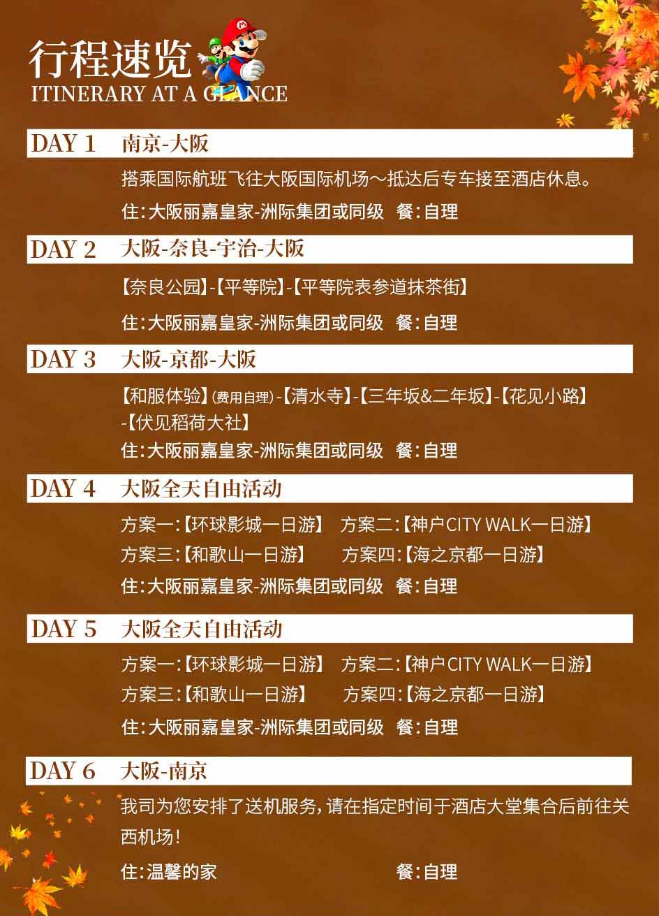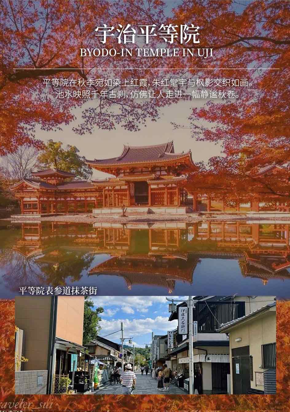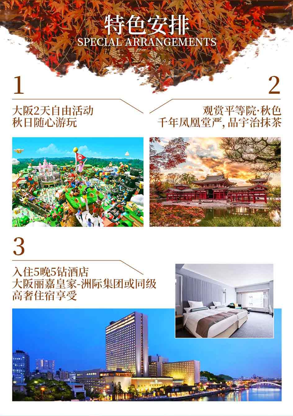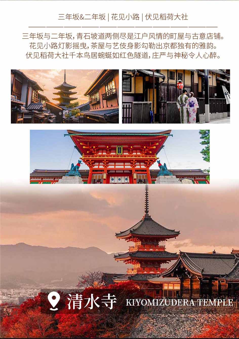 【 费 用 说 明 】 【费用包含】 ①往返含税机票 ②全程网评5钻酒店(2人一间) ③交通行程内用车(接送机(接机90分钟免费等待)+2天10小时内用车),根据人数安排车型; 中文司机服务(司机无法提供全程景点陪同和深度讲解) ④行程中景点首道大门票(清水寺、平等院) ⑤个人旅游签证 【自理费用】 ①单人房差费用 ②行程中自理餐食(如需酒店内早餐,+180元/餐/人) ③个人消费及一切不可抗拒原因所产生的费用 【 温 馨 提 示 】 ①本产品为精致4-9人小团,行程节奏轻松自由,特别安排【中文司机】为您倾情服务,区别于常规跟团产品,司机无法提供全程景点陪同和深度讲解,意在为各位贵宾提供充足的漫步时间,如介意请谨慎选择,谢谢。 ②由于路程相对固定,如前一站的景点观光时间有拖延或途中遇到塞车等不可抗拒的原因,势必会影响下一个景点的观光时间,可能造成下一个景点游玩时间缩短, 不便之处,敬请谅解;在游览过程中请游客自觉遵守时间,按预先约定的时间集合,迟到者自行赴下一站集合。 ③如果因游客自身行为、身体健康等原因,或者因为天气情况飞机停航、大巴滞留等不可抗力原因造成游客财产损失的,我旅行社不承担任何赔偿责任!在境外请听从司机的安排,否则因此产生的一切后果,由自己负责,谢谢合作! ④为响应政府环境保护号召,部分酒店连住时将不再进行客房清扫(但可以更换浴巾等用品),敬请理解,并感 谢您对环境保护的贡献。 ⑤自备签证的客人,请务必自行落实好签证有效期及返程回头签、回乡证等事项。 |